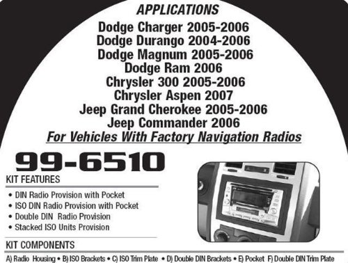 BRAND NEW 99-6510 04-07 DODGE/CHRYSLER/JEEP IN-DASH CD PLAYER MOUNTING KIT TO REPLACE FACTORY NAVIGATION SYSTEM**PERFECT FOR SINGLE DIN OR DOUBLE DIN APPLICATIONS**Features:Perfect for mounting a double din 4" tall radioPerfect for 2" tall single din radioPerfect for (2) 2" tall radio + EQ combo, or radio + DVD combo, etcDIN Radio Provision with PocketISO DIN Radio Provision with PocketDouble DIN Radio ProvisionStacked ISO Units Provision